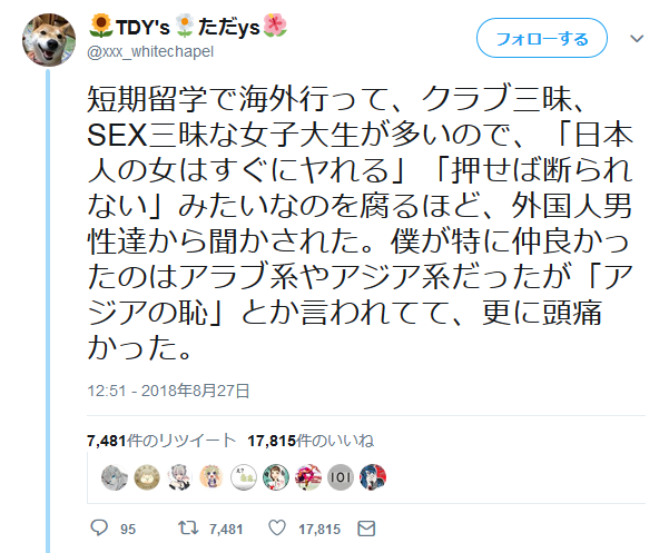 米国に留学中の女子学生がyoutubeで吐露してたけど、↑だから自分は日本人、特に日本人女性だと強く意識させられる。