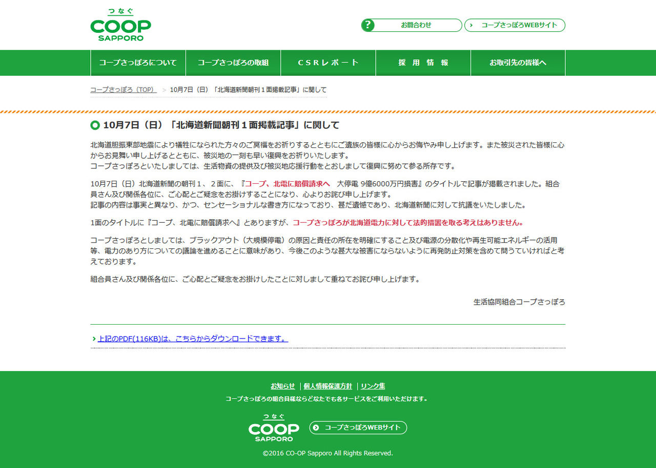 1面のタイトルに『コープ、北電に賠償請求へ』とありますが、コープさっぽろが北海道電力に対して法的措置を取る考えはありません。