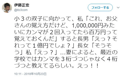 しかし今の小学校では4桁ごとに区切って教えているという。10000の場合は通常「10,000」と表記するが、
