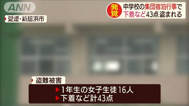 愛媛県の新居浜市教育委員会によりますと、下着の盗難は先月16日から高知県内で実施された中学校の集団宿泊活動で入浴の準備中に発覚しました。被害に遭ったのは1年の女子生徒16人で、下着など43点がなくなっていたということです。