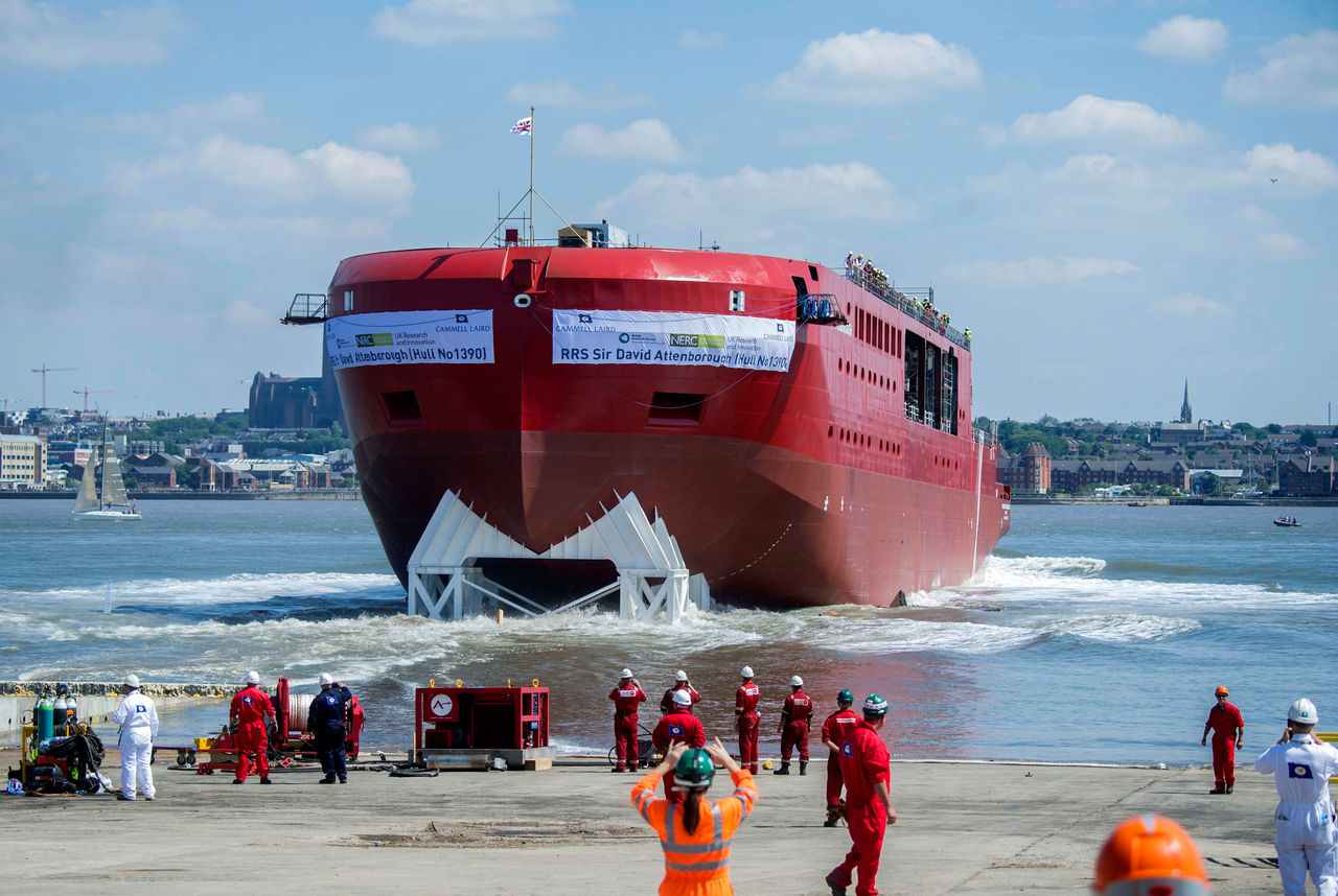 The 10,400-tonne polar research ship, which was eventually named the RRS Sir David Attenborough, was pictured on its cradle making it look like the American hero.