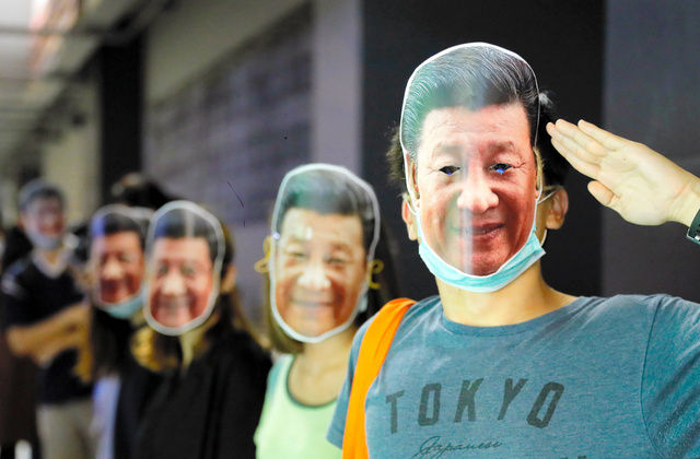 18日夜に香港各地で開かれた抗議デモには、中国の習近平(シーチンピン)国家主席のお面をかぶるなどした多数の市民が参加し、