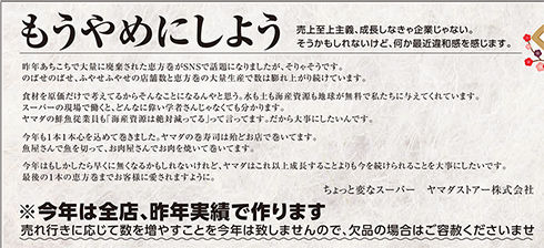 1日に出した、節分用の太巻きや餅を宣伝するチラシに大きな文字で「もうやめにしよう」と記し、「成長しなきゃ企業じゃない。けど、何か最近違和感を感じます」と続けた。