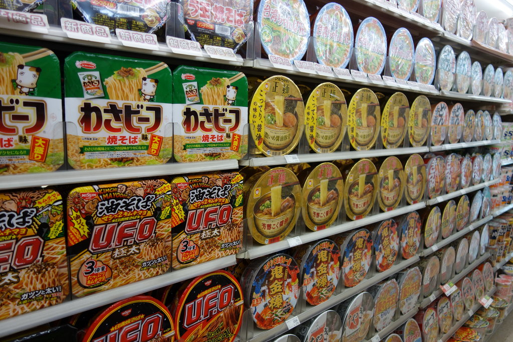 スナック菓子など袋型の商品はしわを伸ばし垂直に立てて並べ、丼型のカップ麺は商品名が一目で分かるよう、ふたを正面に向けて整列。