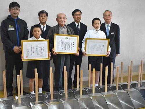 式で児童を代表して喜屋武さんに感謝状を手渡した北中城小6年の後藤朴然(ぼくねん)君(12)と島袋小5年我喜屋雄大君(11)は「(喜屋武さんのちり取りは)使いやすい」と口をそろえる。