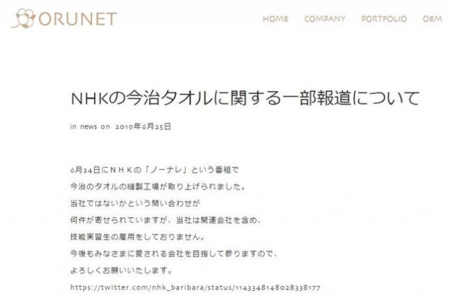 2019年6月24日放送のNHKの番組を受け、タオル製品の製造・販売を行う「オルネット」(愛媛県今治市)が声明を出した。