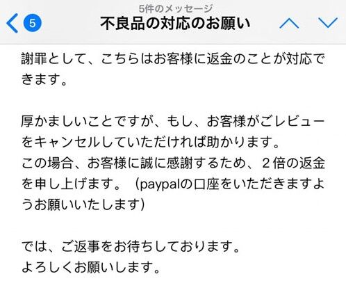 後半に「厚かましいですがそのレビューを削除していただければ2倍の返金対応をさせていただきます」と目を疑う文章があったのです。