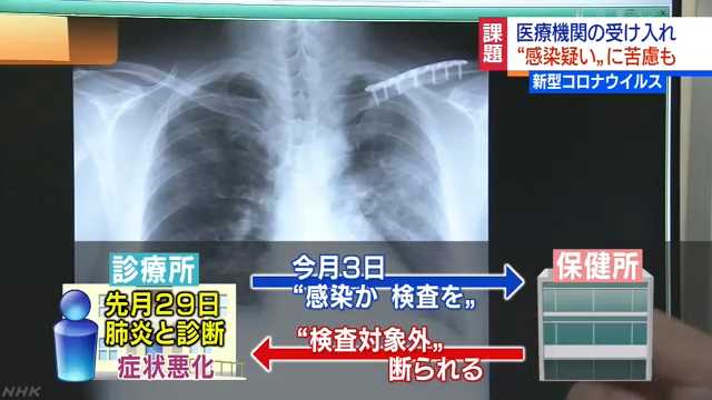 患者の男性は、外国人旅行客と接触する機会もあるため、医師は、新型コロナウイルスへの感染の疑いもあるとして、検査ができないか、今月3日に保健所に問い合わせましたが、国が定める検査対象にはあたらないとして、対応を断られたということです。