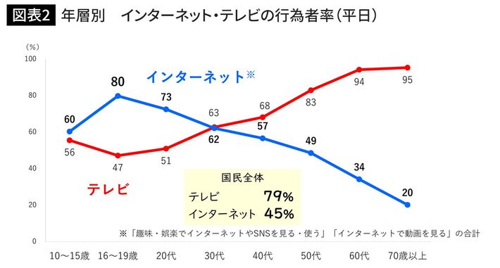一方、平日にインターネットを利用する人は、全体で45%。このうち、16~19歳は80%、20代は73%で、「テレビ離れ」が激しい若者ほどネットの利用率が高くなった。